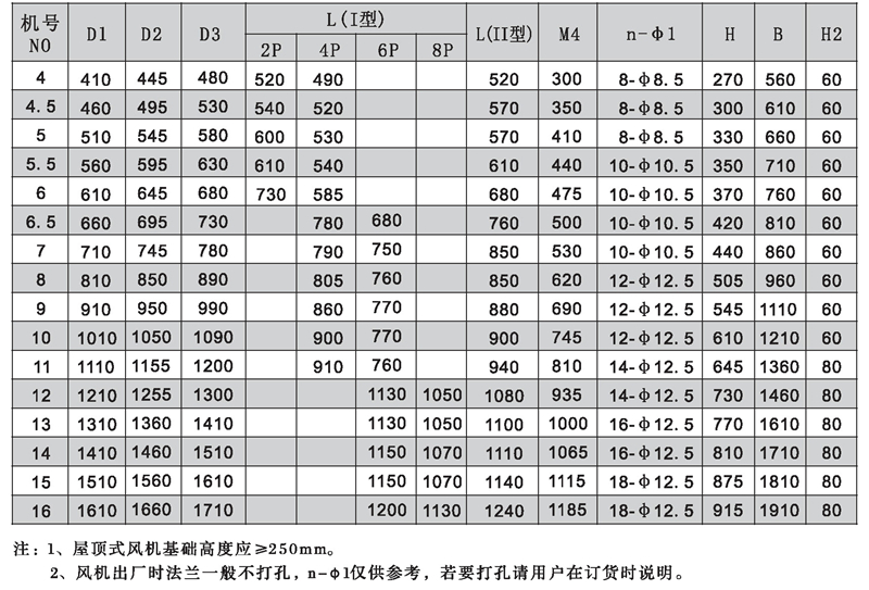 四、HTF型風(fēng)機(jī)外形尺寸表(單位: mm)